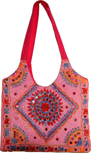 The mirrors and embroidery is only on the front, the back of the purse is plain pink. It closes with a zipper on the top. Inner lining on the entire purse is cotton.