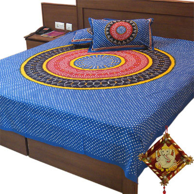 Double bedsheet gift set contains:a. One double bed sheet with set of 02 matching pillow covers of traditional sanganeri print of jaipur. The product comes in an attractive gift packing.B. Free wall hanging in wood having stone cut embossed ganesha idol.