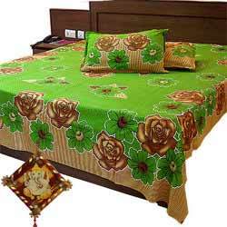 Jaipuri pure cotton 3 pc. Floral print double bedsheet gift set contains:a. One double bed sheet with set of 02 matching pillow covers of traditional sanganeri floral print of jaipur. B. Free wall hanging in wood having stone cut embossed ganesha idol.