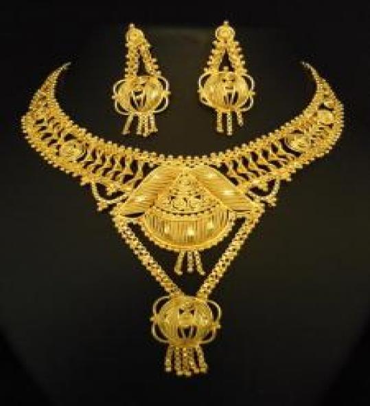 Gold has an universal appeal. The luster and richness of gold is accentuated with fine etchings and moulds, and a myriad of filigree work finished with jhalar pattern. A pair of matching earrings complements the necklace.