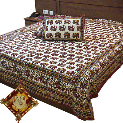 Jaipuri 3 pc. Pure cotton double bedsheet gift set contains:a. One sanganeri elephant print double bed sheet with set of 02 matching pillow covers.B. Free wall hanging in wood having stone cut embossed ganesha idol.