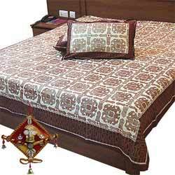 Rajasthani 3 pc. Pure cotton double bedsheet gift set contains:a. One gold print double bed sheet with set of 02 matching pillow covers in traditional barmeri print of rajasthan. B. Free wall hanging in wood having stone cut embossed ganesha idol.Speciality of jaipurspecifications: the bedsheet is having traditional barmeri block print. This gives ethnic and special look to it. The bedsheet is made of 100 % export quality pre-shrunk pure voil cotton of thread count 56x60.