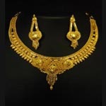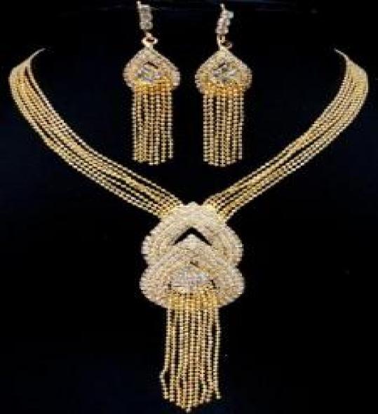 The all metal necklace is simple when materials are concerned and is very sophisticated when it comes to design. Gold has an universal appeal. A pair of matching earrings complements the necklace