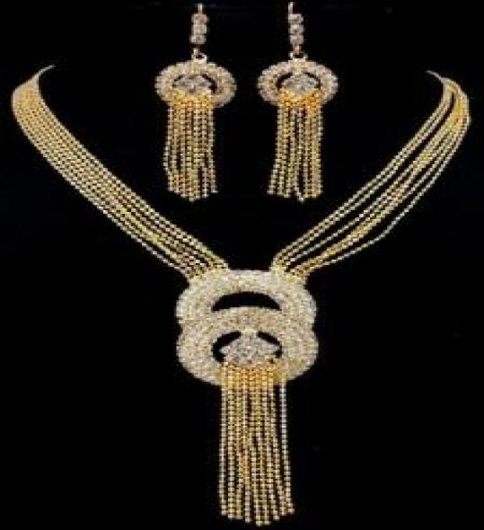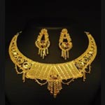 The filigree work includes a myriad of designs to create a unique pleasure for the eyes. At the center is a heart shaped encrusted gold design. A pair of matching earrings complements the necklace