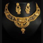 This Gold pendant resembles a beautiful jhalar made with the help of gold chain and unique metal casts. Comes with a pair of similar wing shaped earrings.