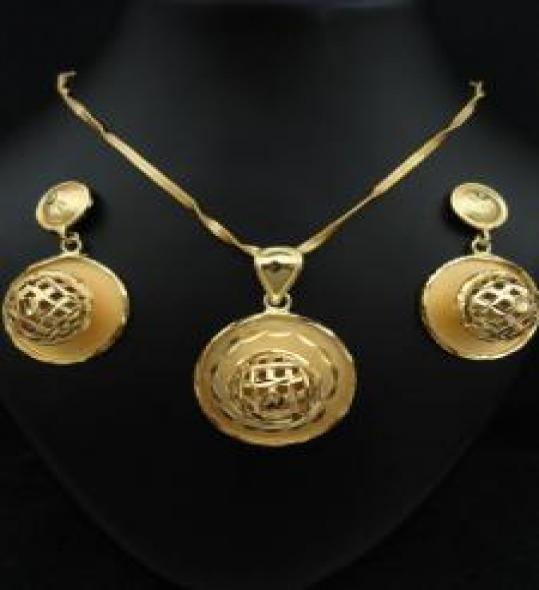 The jhalar design on the metal cast with gold plated chain is a classic, it is really a collectors item. Comes with a pair of matching earrings. The metal used for this pendant is a brass alloy.