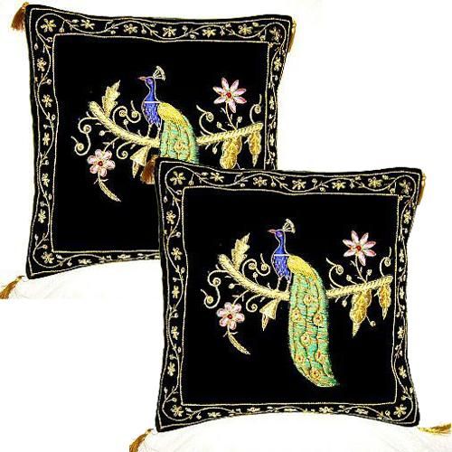 Velvet Base Cushion Covers with Zardozi Embroidered Borders and Heavy Zardozi Embroidery Formed Designs in Relief Look Work : Hand bead Work & embroidery Material : Silk & Threads This price is for per pice Minimum Order Quantity : 5 Pices