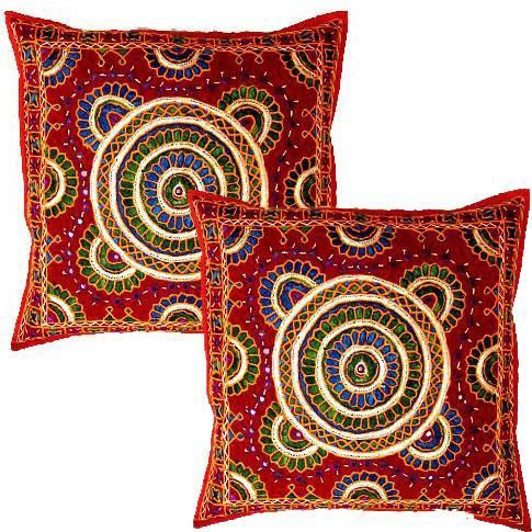 Beautiful handmade Indian cushion cover with a completely hand embroidered and therefore unique. The brightly coloured threads complement the fine Embroidery. Little mirrors which are sewn in by hand in each cushion add a sparkling elegance to this design. The embroidery is on a 100% Indian cotton base. Each cushion cover is hand made in the villages of Barmer in Rajasthan. Work : hand Mirror work, Thread work embroidery Material : Cotton This price is for per pice Minimum Order Quantity : 5 Pices