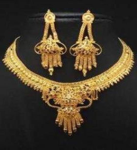 The dazzle of gold with a trendy contemporary design. An excellent design to liven up your evening dress finished with jhalar design. The filigree work includes a myriad of designs to create a unique pleasure for the eyes. A pair of matching earrings complements the necklace.