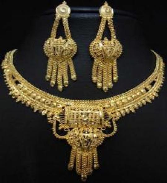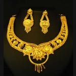Let this beautiful pendant be your lucky charm. The specialty of this pendant is its multi-part design. It is composed of independent designs clasped together with gold chain. The luster and richness of gold is accentuated with fine etchings and moulds, and a myriad of filigree work. Comes with a pair of matching earrings.