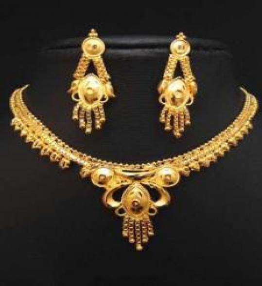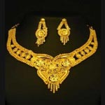 The dazzle of golds with a trendy contemporary design. An excellent design to liven up your evening dress. The sparkling gold diamonds set on a myriad of filigree work. Comes with a matching pair of earrings. The chain is of a hinged type reflecting contemporary style.