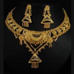 The pendant resembles the shape of the heart so fantastically, studded with dazzling a myriad of filigree work. The luster and richness of gold is accentuated with fine etchings and moulds, and a myriad of filigree work. Comes with a pair of matching earrings.