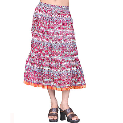 Designer & Sensual- Fancy Maroon Sanganeri Print Cotton Skirt with border in silver and golden zari threads.