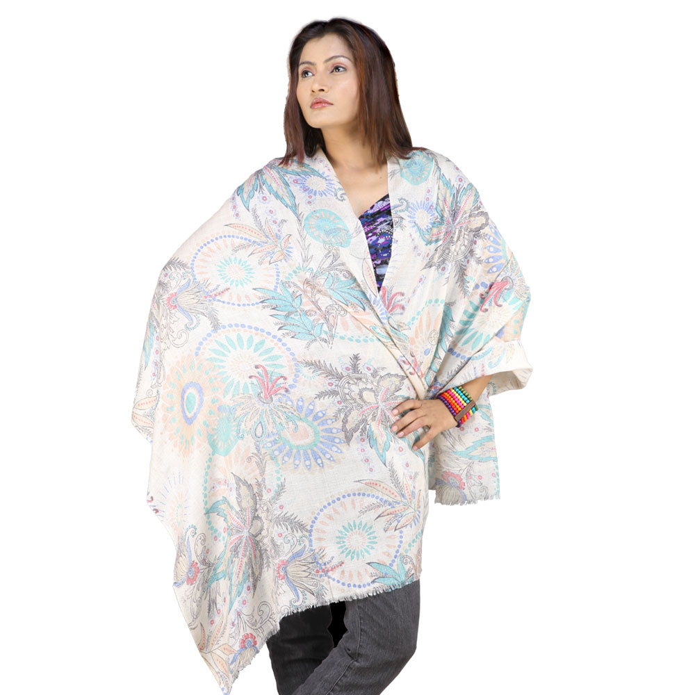 Specifications: Colorful floral hand embroidery on the bootie and floral figures on the main body gives this white base stole a designer look. The floral print in turquiose color on the white overall stole has made it truly awesome. Enjoy this beautiful creation as a dress stole, scarf, head wrap, neck tie or even a beach sarong. The yarn used is very soft against your skin. The stole looks gorgeous with your favorite Sari & Suit. It adds beauty to your entire attire. It is blended with Silk and Raffle woollen yarn to produce cost effective product.