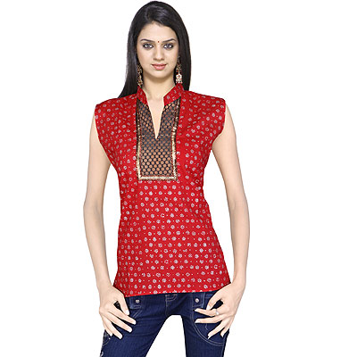 The beauty of the Top is brocade patch work on front. This Top is fully covered with nice silver flower print on red base. This Top can be worn over your favorite jeans, pant, skirt, leggings, salwaar or churidaars. It is versatile for any season and is comfy for any occasion.