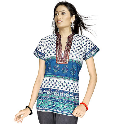 The beauty of the outfit is brocade lace on neck. Be a style statement in this white cotton Top. This Top is fully covered with nice blue flower print on white base. This Top can be worn over your favorite jeans, pant, skirt, leggings, salwaar or churidaars. It is versatile for any season and is comfy for any occasion.