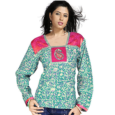 The beauty of the Top is brocade patch work on neck and front. This Top is fully covered with nice green flower print on light green base. The neckline, sleeves and border are enhanced with beautiful golden laces and the shoulders are highlighted with brocade patch work. This Top can be worn over your favorite jeans, pant, skirt, leggings, salwaar or churidaars. It is versatile for any season and is comfy for any occasion.