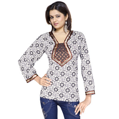 The beauty of the Top is brocade patch work on neck and front. This Top is fully covered with nice black flower print on white base. The neckline and sleeves are enhanced with beautiful golden laces. This Top can be worn over your favorite jeans, pant, skirt, leggings, salwaar or churidaars. It is versatile for any season and is comfy for any occasion.