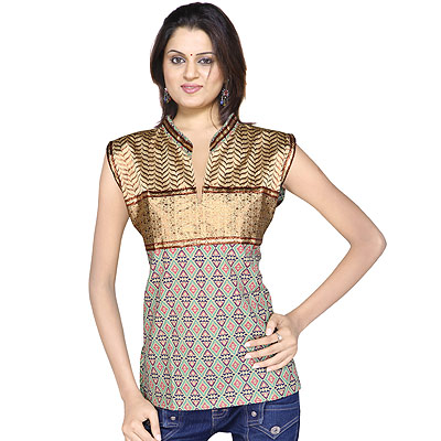 The beauty of the Top is brocade patch work on neck and front. This Top is fully covered with nice blue flower print on dusty base. The neckline and sleeves are enhanced with beautiful golden laces and the shoulders are highlighted with brocade patch work. This Top can be worn over your favorite jeans, pant, skirt, leggings, salwaar or churidaars. It is versatile for any season and is comfy for any occasion.