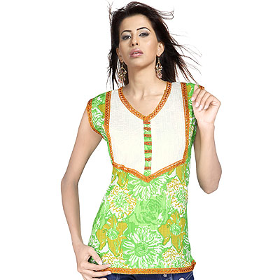 The beauty of the Top is all over Lucknow stitch work. This Top is fully covered with nice flower print on green base. The neckline, sleeves and border are enhanced with beautiful embroidered laces. This Top can be worn over your favorite jeans, pant, skirt, leggings, salwaar or churidaars. It is versatile for any season and is comfy for any occasion.