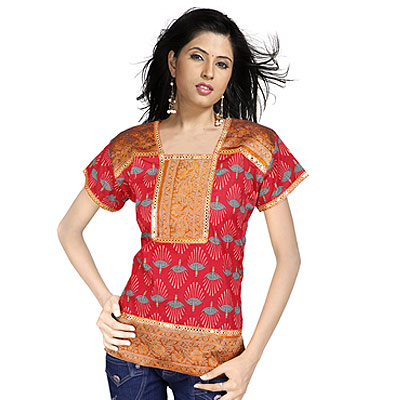 The beauty of the Top is brocade patch work on neck and front. This Top is fully covered with nice blue flower print on maroon base. The neckline, sleeves and border are enhanced with beautiful golden laces and the shoulders are highlighted with brocade patch work. This Top can be worn over your favorite jeans, pant, skirt, leggings, salwaar or churidaars. It is versatile for any season and is comfy for any occasion.