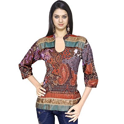The beauty of the Top is brocade patch work on bottom and front. This Top is fully covered with nice paisley & flower print on maroon base. The sleeves and border are enhanced with beautiful golden laces and the shoulders are highlighted with brocade patch work. This Top can be worn over your favorite jeans, pant, skirt, leggings, salwaar or churidaars. It is versatile for any season and is comfy for any occasion.