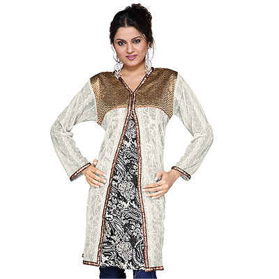 The beauty of the Kurti is brocade patch work on shoulders and front. This Kurti is fully covered with nice white flower print on black base. The neckline, sleeves and border are enhanced with beautiful golden laces and the shoulders are highlighted with brocade patch work. The fancy net sleeves and the front overlay are beauty ofThis exclusive Kurti.This Kurti can be worn over your favorite jeans, pant, skirt, leggings, salwaar or churidaars. It is versatile for any season and is comfy for any occasion.