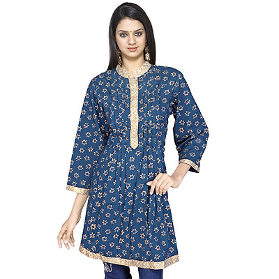 We specialize in offering and supplying designer girls gold print pure cotton kurti top -142 at industry leading prices. This kurti is fully covered with nice gold-print on blue base and can be worn over your favourite jeans, pant, skirt, leggings, salwaar or churidaars. Minimum Order Quantity : 5 Pices
