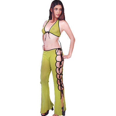 Dont stare for long - Baby Doll Algae green Top -Leggie setA soft & sensual Baby Doll Top -Leggie set in seducing algae green color with lacy design pattern made from finest Korean power net and lace fabric. Very soft and comfortable evening wear with strap work across the front of the Bra and sides of the pyjama to give that seductive look to the lady of your heart. The see thru strap work is revealing. If you have come from your work, go directly to your study; otherwise cancel your assignments for the evening. Its difficult to sTop getting naughty. Size: Free (Fits burst size of 30 -36"). Color: Algae Green Wash Care: Please get the product drycleaned for the first time to maintain the vibrancy of the fabric. Thereafter, regular machine or hand wash in normal or luke warm water. Return Policy: No Returns or Refunds shall be accepted due to hygiene reasons. Minimum Order Quantity 5 Piecs
