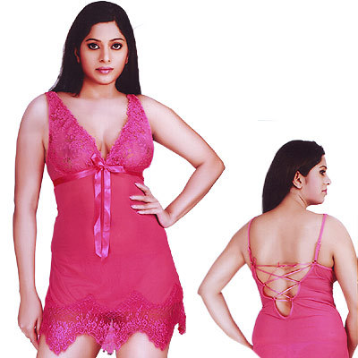 Sheer Ruffle Baby Doll Nightwear in PinkA Sensual Nightwear made from finest four -way stretch Korean power net fabric with matching panties. Very soft and comfortable wear with straps. Size: Free (Fits burst size of 30 -36"). Color: Soft Pink Wash Care: Please get the product drycleaned for the first time to maintain the vibrancy of the fabric. Thereafter, regular machine or hand wash in normal or luke warm water. Return Policy: No Returns or Refunds shall be accepted due to hygiene reasons. Minimum Order Quantity 5 Piecs