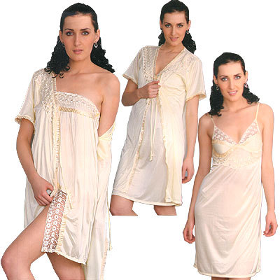 My Mermaid !! Soft Creamy 3 -Pc Bridal Sexy Night Wear:A soft & sensual 3 -piece set in seducting off white color with lacy design pattern made from finest Korean power net and lace fabric. Very soft and comfortable off -shoulder short gown gives that calling look to the lady of your desire. The see thru net is revealing. If you have come from your work, go directly to your study. Dont get seduced by her calls and see her in that body hugging dress. Otherwise cancel your assignments for the evening. Size: Free (Fits burst size of 30 to 36 inches). Color: Soft Off white Wash Care: Please get the product drycleaned for the first time to maintain the vibrancy of the fabric. Thereafter, regular machine or hand wash in normal or luke warm water. Return Policy: No Returns or Refunds shall be accepted due to hygiene reasons. Minimum Order Quantity 5 Piecs
