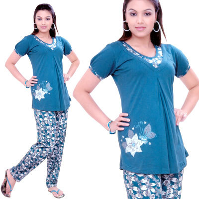 Youre Welcome Hubby: Baby Doll Blue -White Top -Pyjama Set:Look effortlessly gorgeous in this blue top and floral print white Pyjama set. The ribbed round neck top has flower motiffs. The matching stretchable cotton pants have an elasticated waistband all over. You will just blame this dress for that naughtiness. Size: Free (Fits burst size of 30 to 36 inches) Color: Blue & White Wash Care: Please get the product drycleaned for the first time to maintain the vibrancy of the fabric. Thereafter, regular machine or hand wash in normal or luke warm water. Return Policy: No Returns or Refunds shall be accepted due to hygiene reasons. Minimum Order Quantity 5 Piecs