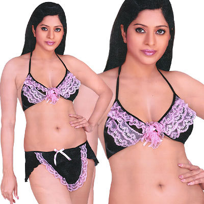 Super Hot !! Bridal Honeymoon Pink & Black Bikini Set:This racy lacy number is sure not to leave much to anyones imagination. The styling includes pink lacy layers on the triangle cups. Halter neck back fastening straps make the outfit more hot. It comes with matching designer panty. The pink color net lace & drawstring bow on the waistband gives the dress a horny look. Team with hold ups to complete the look. She very well knows that legs are your weekness..... Dont let her loose in this dress. Size: Free (Fits burst size of 30 to 36 inches). Color: Black & Pink Wash Care: Please get the product drycleaned for the first time to maintain the vibrancy of the fabric. Thereafter, regular machine or hand wash in normal or luke warm water. Return Policy: No Returns or Refunds shall be accepted due to hygiene reasons. Minimum Order Quantity 5 Pices