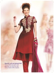 Get the modish look in this nice shade kameez with exquisite embroidery pattern. Nice neckline is adorned with geometric pattern work. Simple but attractive embroidery done on this twill cotton fabric. Small studs are used to enhance the beauty. Different fancy border of net and velvet.