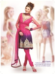Get the modish look in this nice shade kameez with exquisite embroidery pattern. Nice neckline is adorned with geometric pattern work. Simple but attractive embroidery done on this twill cotton fabric. Small studs are used to enhance the beauty. Different fancy border of net and velvet.