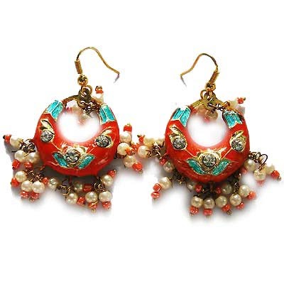We here offer traditionally designed jaipuri lacquer red bali Earrings fashion jewelry -These earrings have lacquer work on silver sheet base in naughty orange colour.