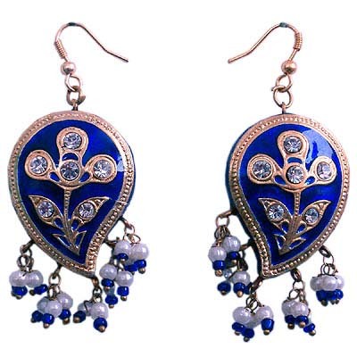 Traditionally designed earrings in lacquer work on Silver sheet base in lively blue color. The earrings can be worn with Indian as well as Western outfits. Perfect accessory to go along with any kind of ensemble on all occasions. Lacquer jewellery is an art form practised in Rajasthan and involves fusing lacquer (a natural extract) which comprises the engraved design with beaten pure silver metal sheet. Lacquer is a clear or coloured varnish, that dries by solvent evaporation and can be further polished as required.