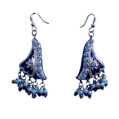 A feminine touch- Handcrafted lacquer earrings with pearl bead danglers in royal blue colour. Perfect accessory to go along with any kind of ensemble on all occasions. Lacquer jewellery is an art form practised in Rajasthan and involves fusing lacquer (a natural extract) which comprises the engraved design with beaten pure silver metal sheet. Lacquer is a clear or coloured varnish, that dries by solvent evaporation and can be further polished as required.
