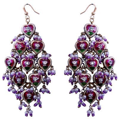 Beautifully handcrafted Lacquer Earrings in pretty Magenta & Green colour with pearl bead danglers. One can wear them as stand alone with traditional wear as well as with Indo-Western fusion wear with fine panache. You can also team them with other matching jewellery pieces to look aptly dressed for the grand occasions. Perfect accessory to go along with any kind of ensemble on all occasions. Lacquer jewellery is an art form practised in Rajasthan and involves fusing lacquer (a natural extract) which comprises the engraved design with beaten pure silver metal sheet. Lacquer is a clear or coloured varnish, that dries by solvent evaporation and can be further polished as required.