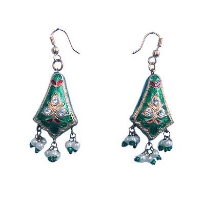 Go Green with these handcrafted pair of Lacquer earrings with pearl bead danglers in sea green colour. Perfect accessory to go along with any kind of ensemble on all occasions. Lacquer jewellery is an art form practised in Rajasthan and involves fusing lacquer (a natural extract) which comprises the engraved design with beaten pure silver metal sheet. Lacquer is a clear or coloured varnish, that dries by solvent evaporation and can be further polished as required.