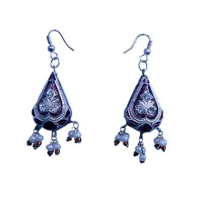 Traditionally designed earrings in lacquer work on Silver sheet base in lively Muave Black colour. The earrings can be worn with Indian as well as Western outfits. Perfect accessory to go along with any kind of ensemble on all occasions. Lacquer jewellery is an art form practised in Rajasthan and involves fusing lacquer (a natural extract) which comprises the engraved design with beaten pure silver metal sheet. Lacquer is a clear or coloured varnish, that dries by solvent evaporation and can be further polished as required.