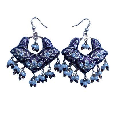 Traditionally designed earrings in lacquer work on Silver sheet base in lively Muave Black current colour. The earrings can be worn with Indian as well as Western outfits. Perfect accessory to go along with any kind of ensemble on all occasions. Lacquer jewellery is an art form practised in Rajasthan and involves fusing lacquer (a natural extract) which comprises the engraved design with beaten pure silver metal sheet. Lacquer is a clear or coloured varnish, that dries by solvent evaporation and can be further polished as required.