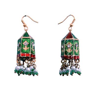 Exclusive Red & Green color handcrafted pair of lacquer earrings with pearl bead danglers.The pair is traditional bali style and big in size giving an elegant look. Perfect accessory to go along with any kind of ensemble on all occasions. Lacquer jewellery is an art form practised in Rajasthan and involves fusing lacquer (a natural extract) which comprises the engraved design with beaten pure silver metal sheet. Lacquer is a clear or coloured varnish, that dries by solvent evaporation and can be further polished as required.