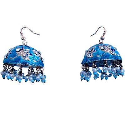 Traditionally designed earrings in lacquer work on Silver sheet base in lively turquoise colour. The earrings can be worn with Indian as well as Western outfits. Perfect accessory to go along with any kind of ensemble on all occasions. Lacquer jewellery is an art form practised in Rajasthan and involves fusing lacquer (a natural extract) which comprises the engraved design with beaten pure silver metal sheet. Lacquer is a clear or coloured varnish, that dries by solvent evaporation and can be further polished as required.