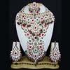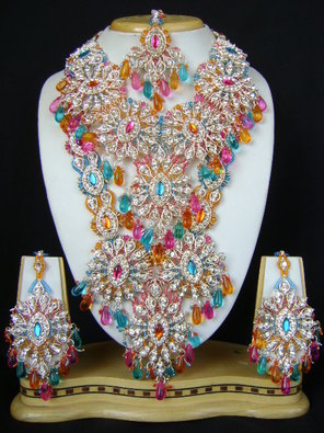 This Bridal pendant is a celebration of colors. Pink, golden, white and blue polki stones are studded on the metal base to exude a unique charm. Comes with a pair of matching earrings.