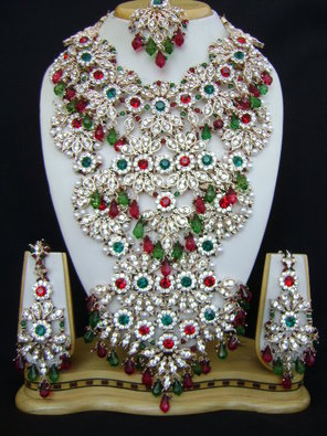 Rich green and maroon polki stones are studded on the metal cast in plenty and according to a set pattern. The use of green beads add all the more vitality to the piece. Comes with a pair of matching earrings.