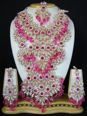 Pink polki stones are studded on the metal cast in plenty and according to a set pattern. The use of dangling pink and white beads add all the more charm to this Bridal piece. The metal used for the pendant is a brass alloy with a shining silver polish.
