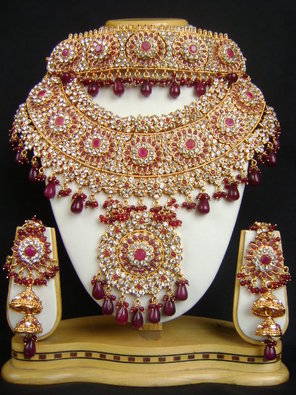 Crafted with precision, skill and care for that very special day of yours, this is really a collectors item. The zirconia stones are studded on the golden metal in an intricate arrangement to produce a wonderful effect. The entire lower margin of the necklace is lined with tufts of small burgundy red dangling beads.