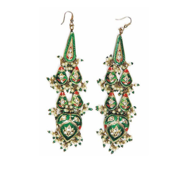 A traditional handcrafted Earring set originating from India.The color of the set is made of enamels, also known as meenakari, and it is intricately hand made with beads,imitation pearls, and cz stones.