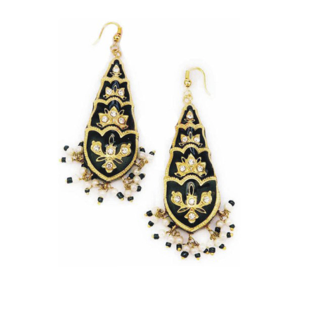 A traditional handcrafted Earring set originating from India.The color of the set is made of enamels, also known as meenakari, and it is intricately hand made with beads,imitation pearls, and cz stones.